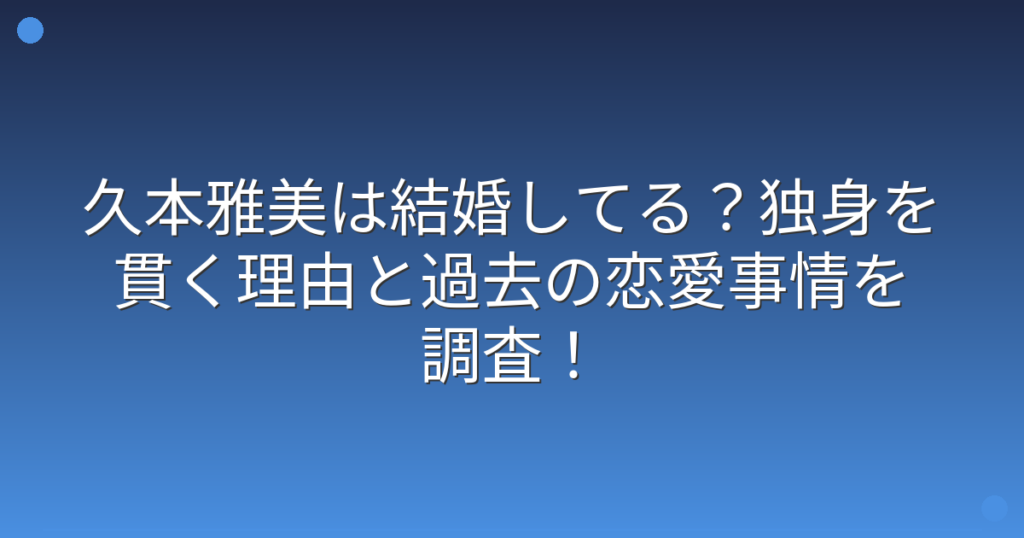 芸能界で長年活躍されている久本雅美さんですが、結婚についての話題が度々注目を集めていますね。 バラエティ番組で明るいキャラクターを見せる久本雅美さんですが、プライベートでは結婚されているのか気になる方も多いのではないでしょうか。 そこで今... -