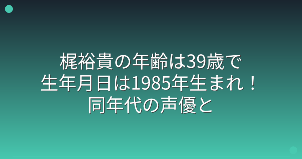 人気声優の梶裕貴さんの年齢について、ファンの間で話題になっていますね。 若々しい声と演技力で幅広い役をこなす梶裕貴さんですが、実際の年齢はいくつなのでしょうか。 そこで今回は、梶裕貴さんの年齢や生年月日、同年代の声優との比較について詳しく... -