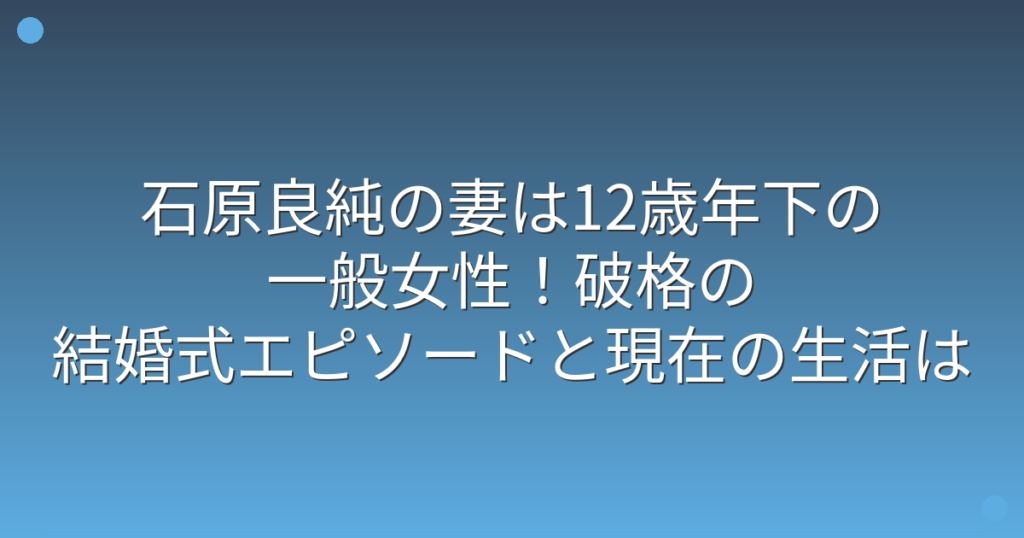俳優で気象予報士としても活躍する石原良純さんの妻について、最近話題になっていますね。 2025年11月の「徹子の部屋」出演をきっかけに、石原家の結婚式エピソードが注目を集めています。 そこで今回は、石原良純さんの妻について、12歳年下という年齢差... -