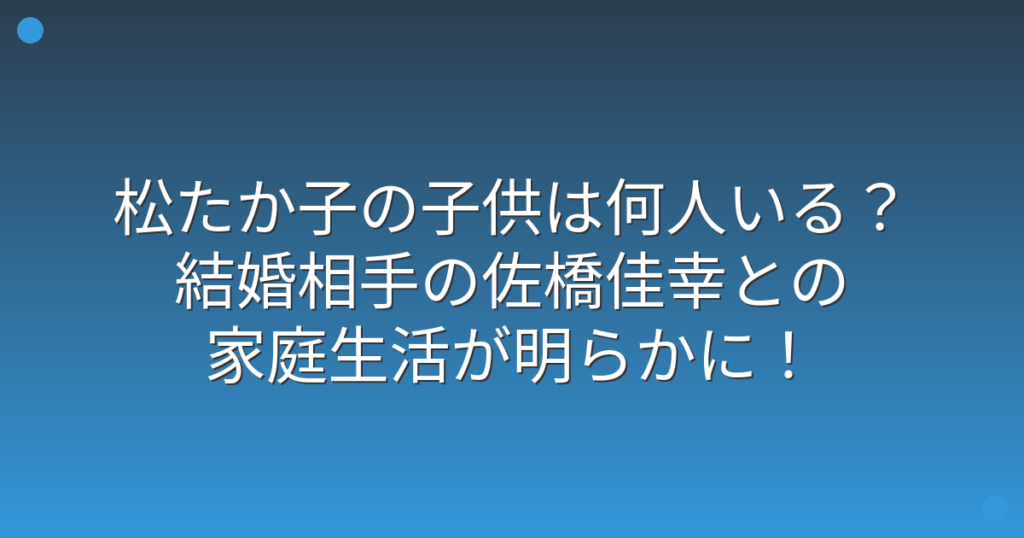 女優として活躍する松たか子さんですが、プライベートでは結婚されており、子供についても気になっている方が多いようですね。 松たか子さんの子供に関する情報は、あまり公にされていないため、多くのファンが関心を寄せています。 そこで今回は、松たか... -