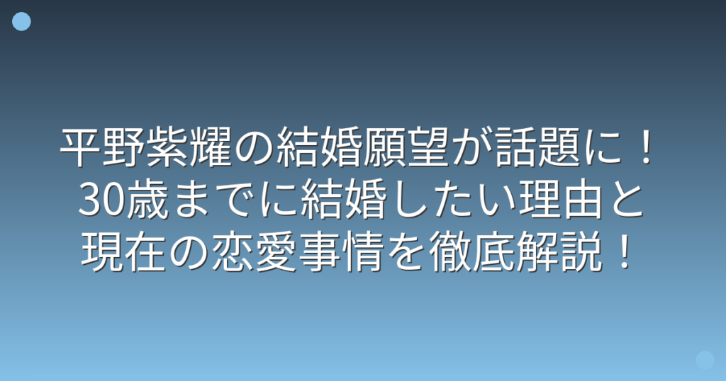 元King & Princeのメンバーとして知られる平野紫耀さんの結婚に関する話題が、最近大きな注目を集めています。 特に「30歳まで結婚を待てない」という発言が波紋を呼び、ファンの間でも大きな話題となっているようです。 そこで今回は、平野紫耀さんの結婚... -