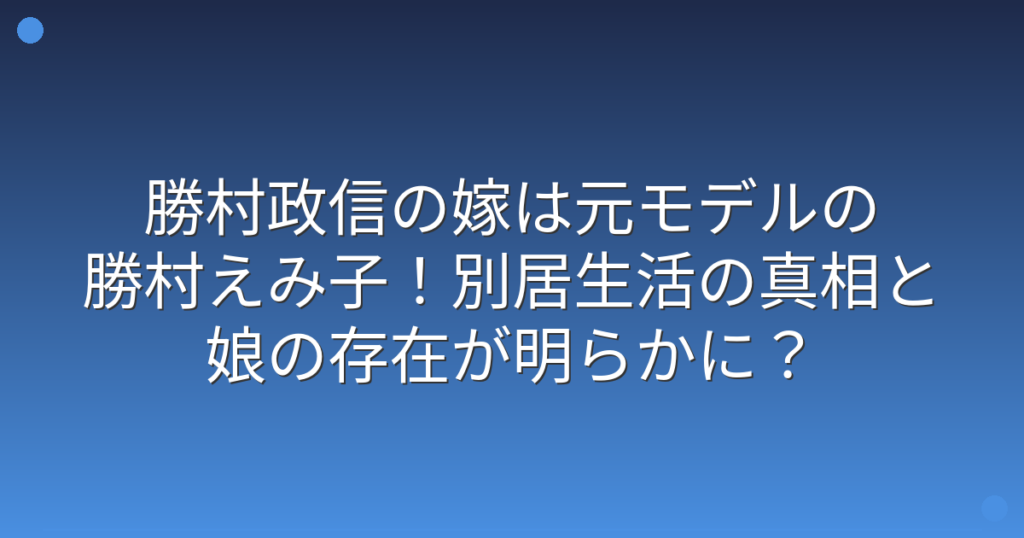 俳優の勝村政信さんの私生活について、ネット上で様々な噂が広がっていますね。 特に気になるのが、勝村政信さんの結婚生活や家族関係についてです。 そこで今回は、勝村政信さんの嫁や家族関係について、詳しく見ていきましょう! 勝村政信の嫁・勝村えみ... -