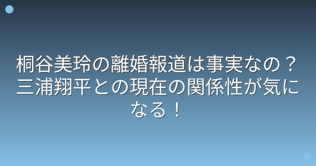 最近、桐谷美玲さんと三浦翔平さんの夫婦関係について、様々な憶測が飛び交っているようです。 特にSNSでは離婚に関する噂が広がり、多くの人々の関心を集めています。 そこで今回は、桐谷美玲さんの離婚報道の真相や、三浦翔平さんとの現在の関係性につい... -