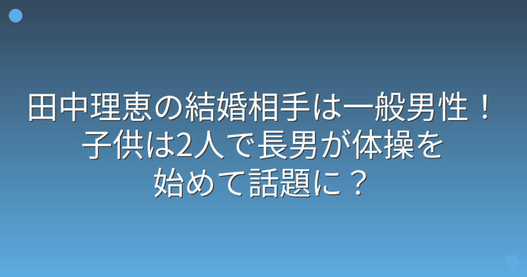 元体操日本代表の田中理恵さんの結婚生活が、最近特に注目を集めています。 特に、長男が体操を始めたことがSNSで話題となり、多くの反響を呼んでいます。 そこで今回は、田中理恵さんの結婚相手や家族構成、現在の生活について詳しく見ていきましょう! ...
