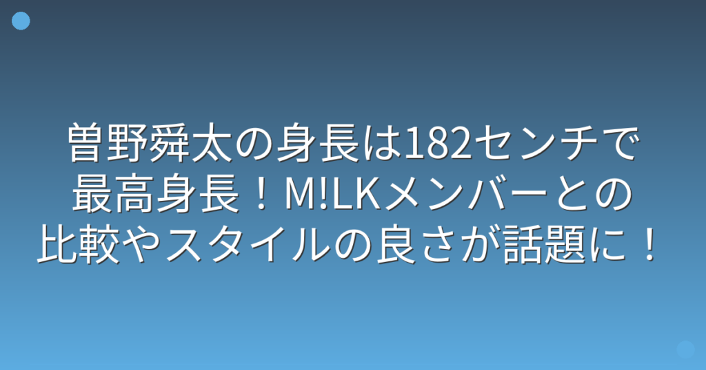 M!LKの最年少メンバーとして活躍する曽野舜太さんの身長が注目を集めていますね。 高身長でありながら親しみやすいキャラクターとのギャップが、ファンの間で大きな話題になっています。 そこで今回は、曽野舜太さんの身長やM!LKメンバーとの比較、そして...